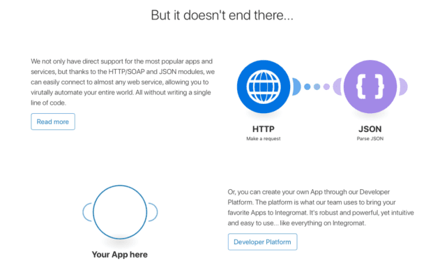 And on top of that, its capacity to connect to services using JSON and HTTP/SOAP modules and the ability to create your own apps on our developer platform, allows you to virtually automate anything.