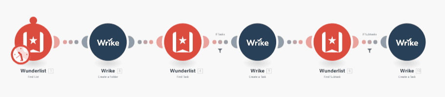 As with Trello and Asana, you can deploy Make's Wunderlist - Wrike template to start the transition today and get everything in place once Wunderlist shuts down.