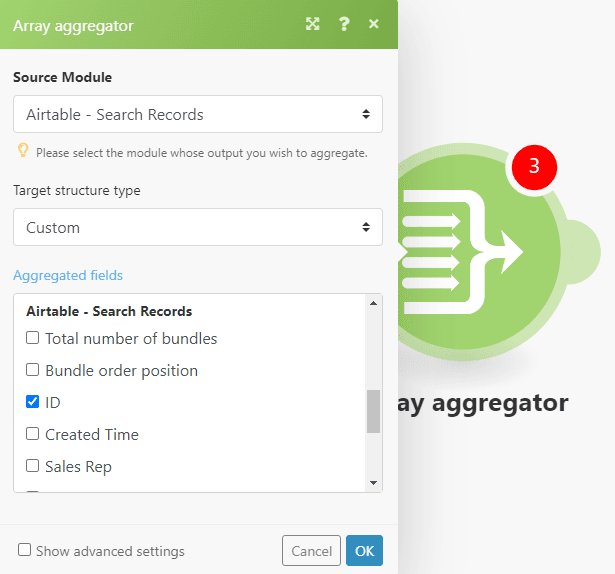 Since you want to aggregate the Airtable records, select this as the Source. The “Target structure type” is automatically selected for you, so all you need to do is tick ID under Airtable > Search records in the “Aggregated fields” box.