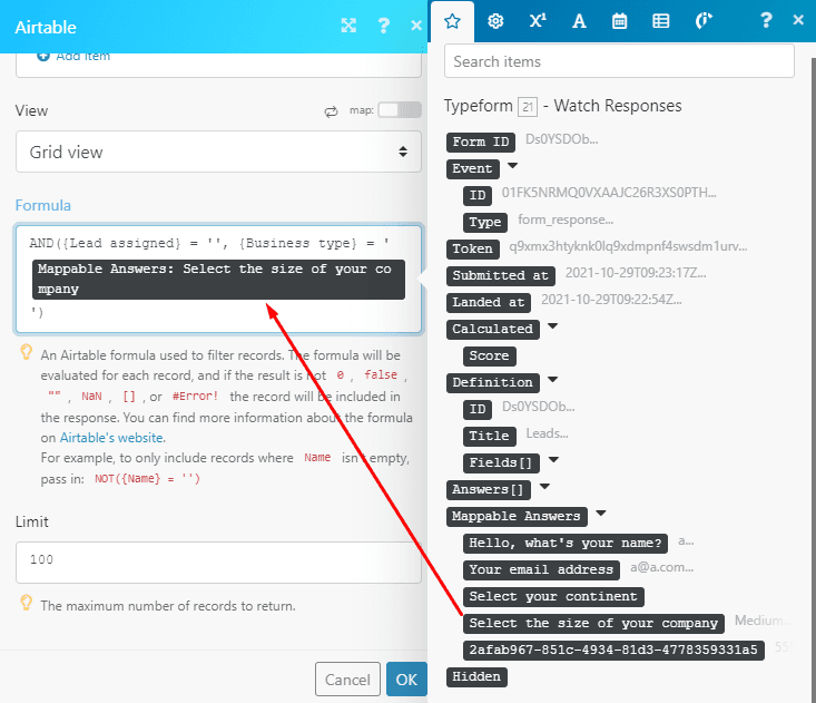 AND({Lead assigned} = '', {Business type} = 'Typeform answer')