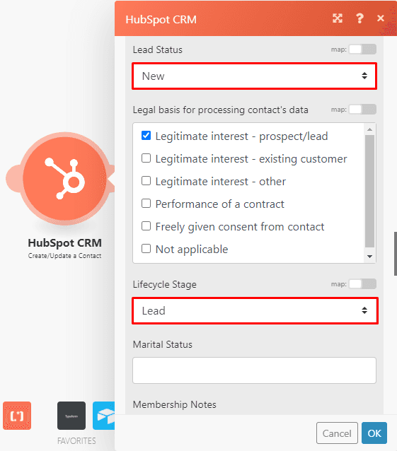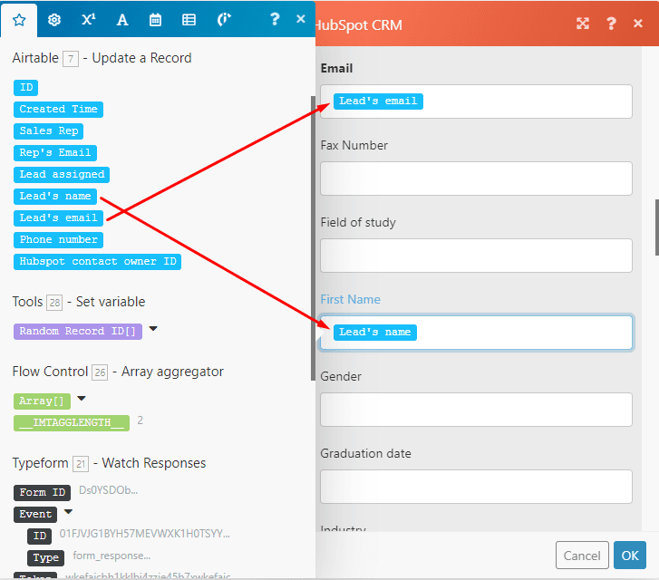 Next, map the Lead’s email and Lead’s name elements from the Airtable module to the matching fields in the HubSpot module.