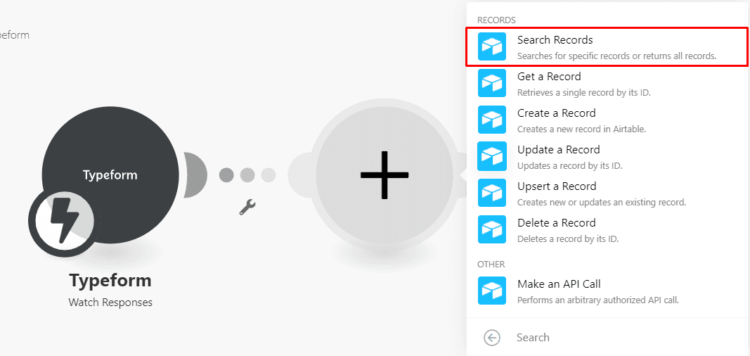 Similarly, you will see a list of options on a pop up. Search for the Airtable app, and select the “Search records” module.