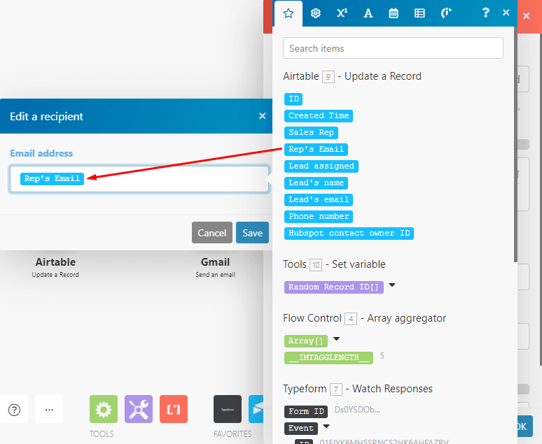 The email addresses of the reps are already on the Airtable table so let’s map it in the module.
