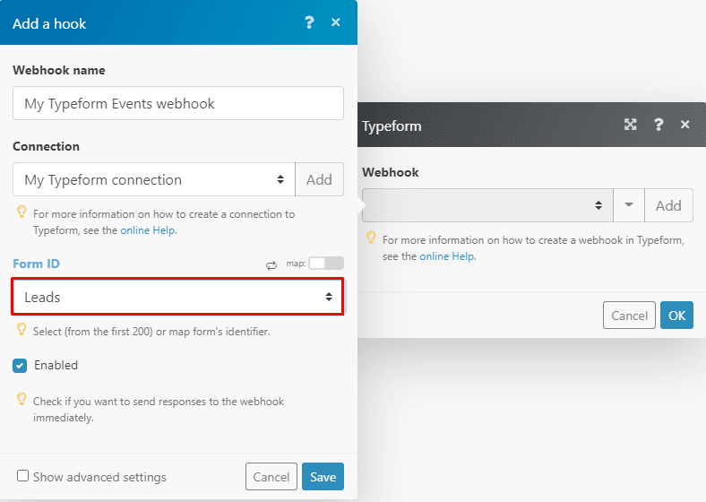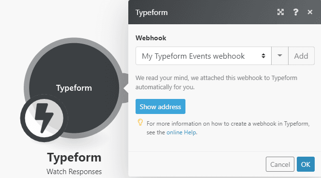 The webhook is now configured and automatically attached to your selected Typeform, so you don't need to do anything more here. Once done, hit “OK”.