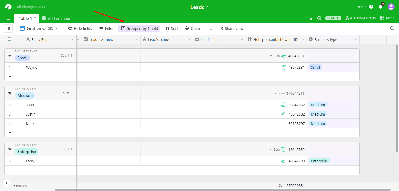 Lastly, hit the “Group by” option and select the “Business type” column again - now you have everything organized.