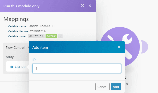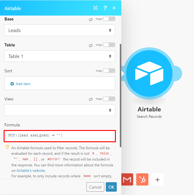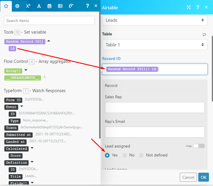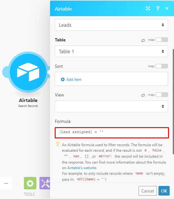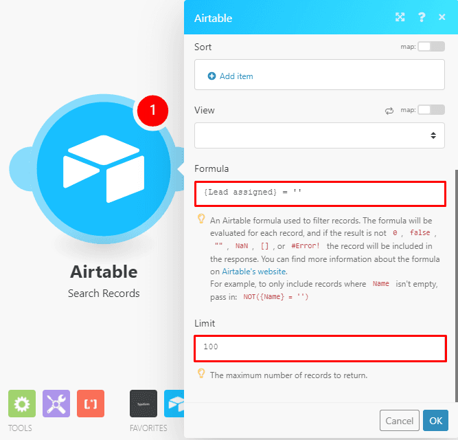 So this module will retrieve all the records containing sales reps that haven’t been assigned with a lead. But as it stands, the Airtable module searches for the records on the table from top to bottom, and not randomly as we want.