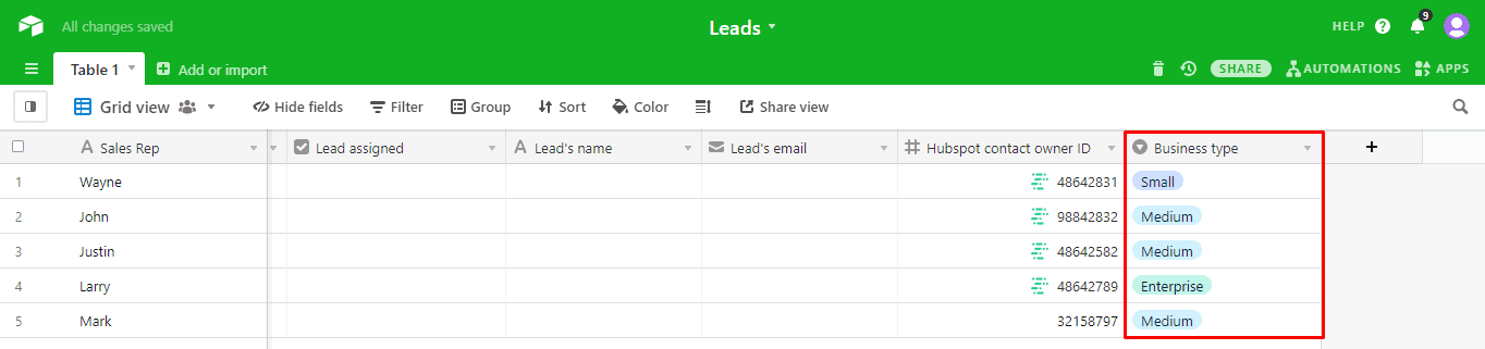Depending on which rep is handling each type of lead, assign it to them accordingly. It should look like this: