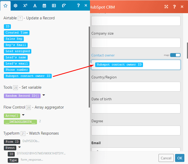Once all the reps have their contact owner IDs in Airtable, map the “HubSpot contact owner ID” element from the “Airtable > Update a record” module to the “Contact owner” field to make it dynamic.