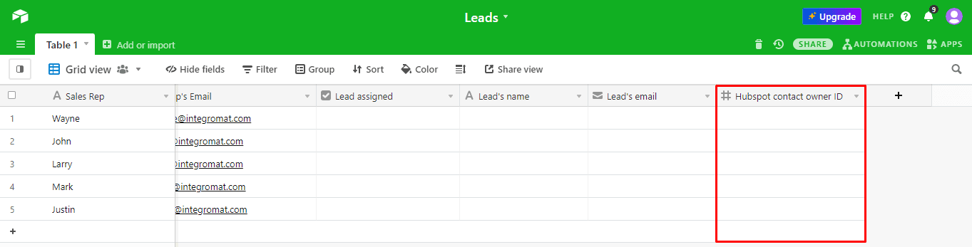 In the second step of this tutorial we mentioned that the Airtable base has a field for the sales rep’s HubSpot contact owner ID that you should add manually.