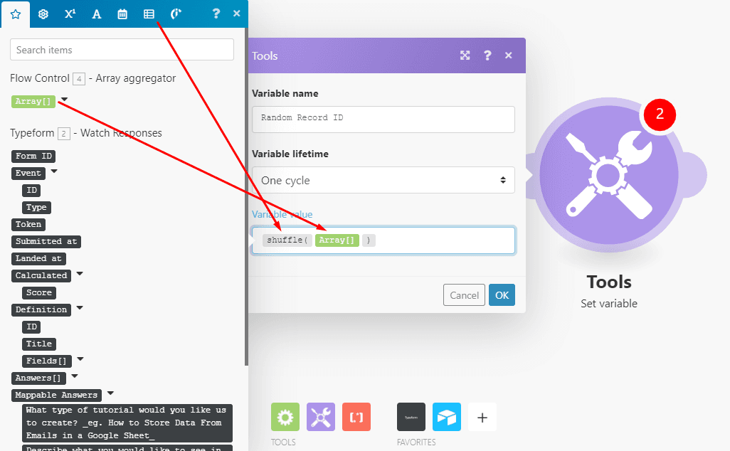 Down in the Tools menu, select the “Set variable” module and attach it to the array aggregator.