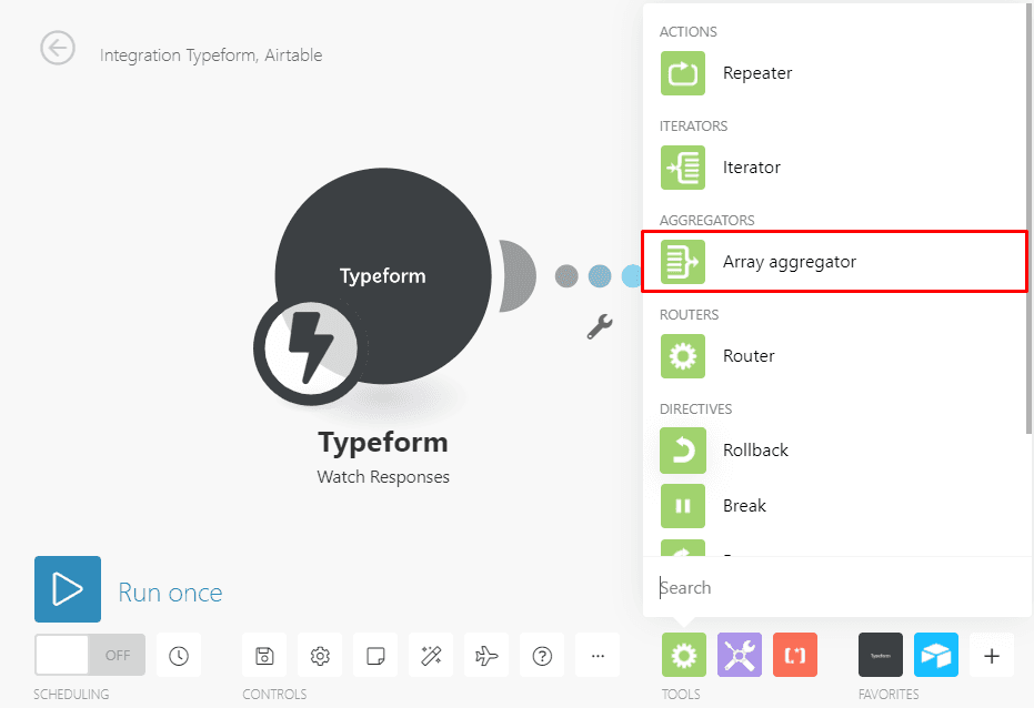 Click it, select the “Flow Control” option, and then select the “Array Aggregator” and attach it to your scenario by dragging it over the Airtable module.
