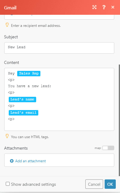 Now that the sales rep has been assigned the lead, it’s time to email the lead’s details to the rep, as well as add both parties (lead and rep) to HubSpot.