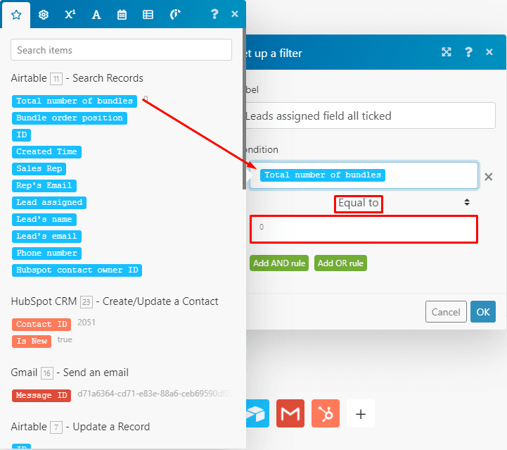 As the formula suggests, this module searches if the “Leads assigned” column has any empty or unticked records. If all fields are ticked, the module will output 0 bundles of data.