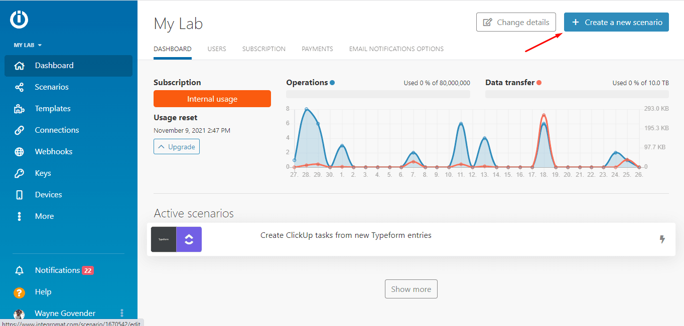 After you log in to your Make account, you will be taken to your dashboard. Here, click the “Create a new scenario” button located on the top right of your screen.