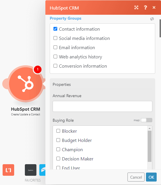 Since we need to add the lead as a contact with the assigned sales rep to Hubspot CRM well, let’s proceed to add the corresponding HubSpot module to our scenario.