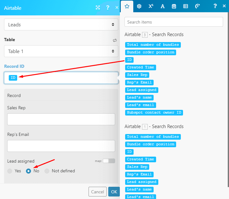 In the module’s configuration box, map the ID element outputted by the previous “Search records” Airtable module and select the “No” option under “Lead assigned”. This will do the job of clearing the column for you.