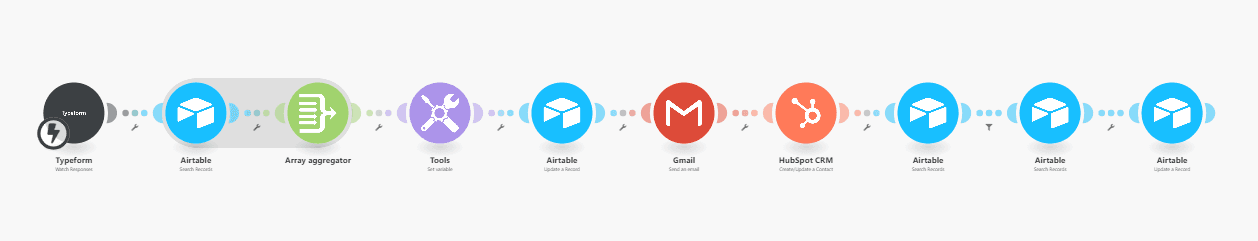 The next step is to integrate Airtable with Typeform, so back to the Make scenario.