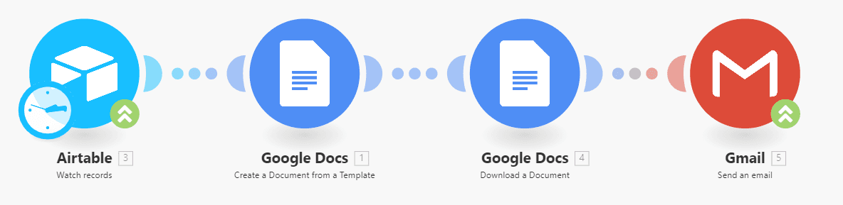 With Make, you can automate the creation of documents from spreadsheet data from Airtable, Excel, or Google Sheets and send it to the other users for review. Make’s template is particularly useful for automating processes that require recurring reporting of dynamic data like sales data.