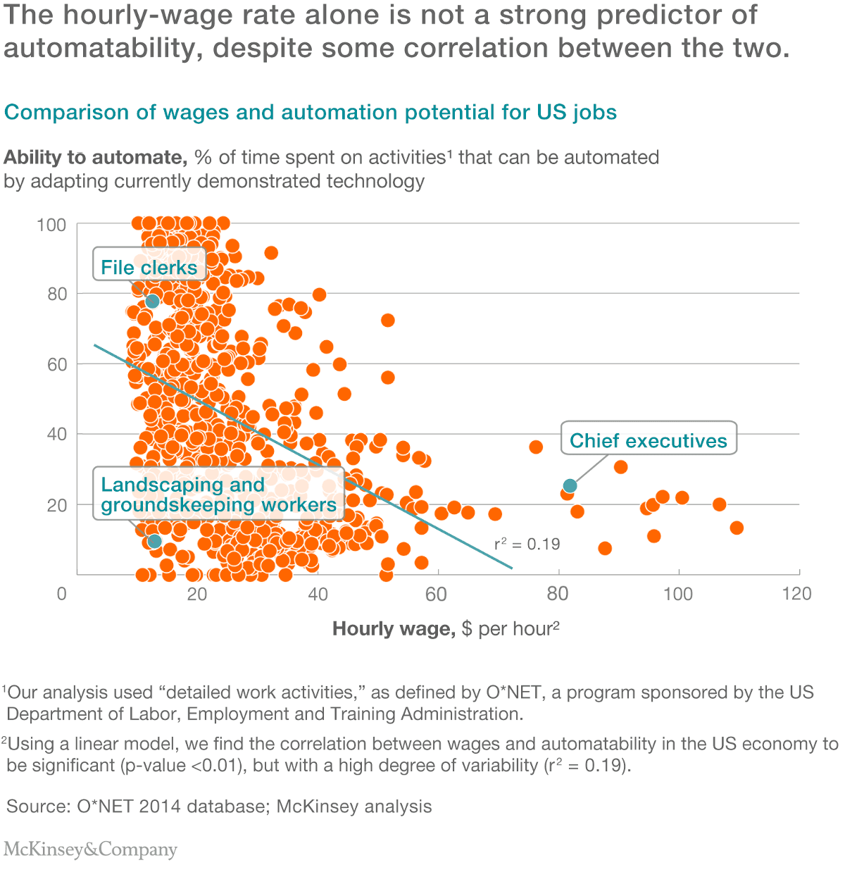 Interestingly enough, the report also shows that occupations with lower wages (such as home health aides, landscapers, and maintenance workers) are not necessarily easier to automate with current technologies: