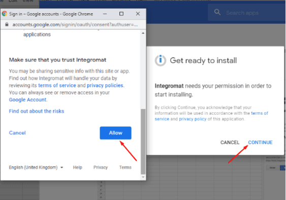 Sign into your Google account and click the Allow button at the bottom right to grant Make access to your account: