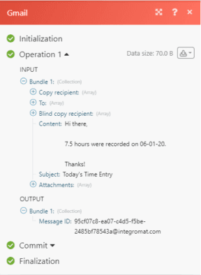 If you view the output of the Gmail module, you can see that the bundle of data passed through from the Google Sheets module to this module as an input and the email with the required information was sent to the intended recipient:
