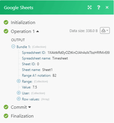 Here you can see that the Google Sheets module outputted 1 bundle of data corresponding to the row of data on the sheet: