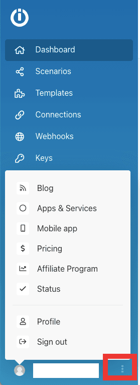 Once you have an Make account, go to your dashboard, click the three dots at the bottom left of your screen, and press “Affiliate Program”.