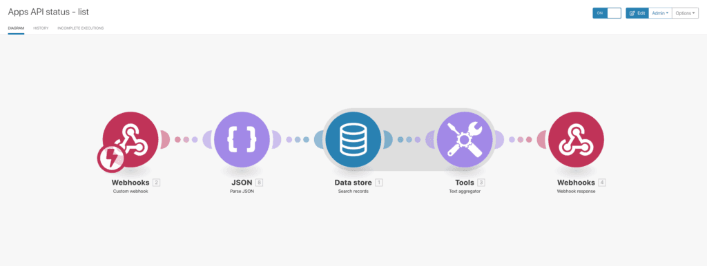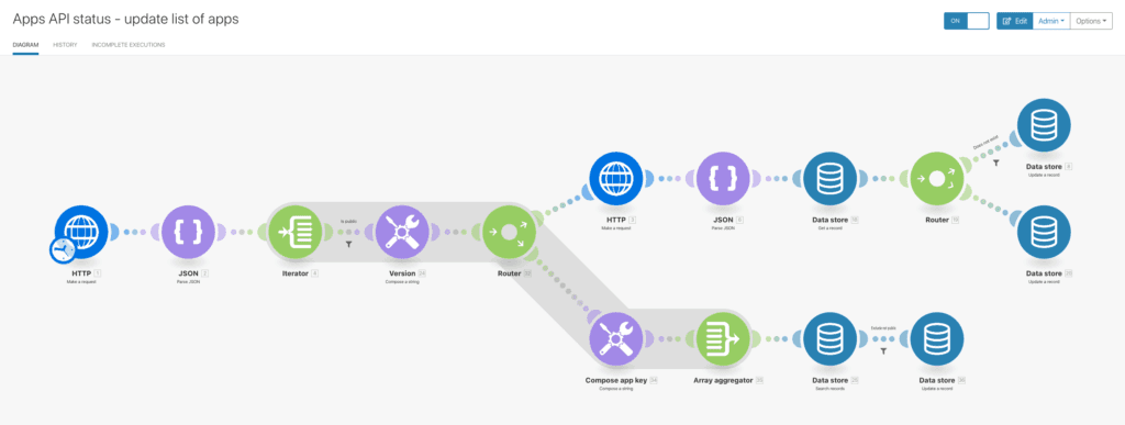 Our API checker. This scenario gets lists of apps from Make and sends them to data stores.