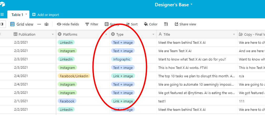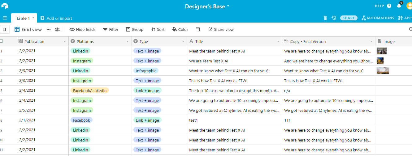 So, whenever a record/task requiring design gets added to the Social Media Content Calendar base, that exact record/task will be copied into the Designer’s base, automatically.