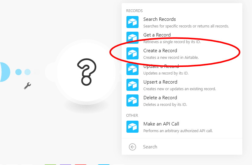 You should now see Airtable as your predefined app choice: click on it, and then select the “Create a record” module.