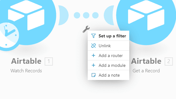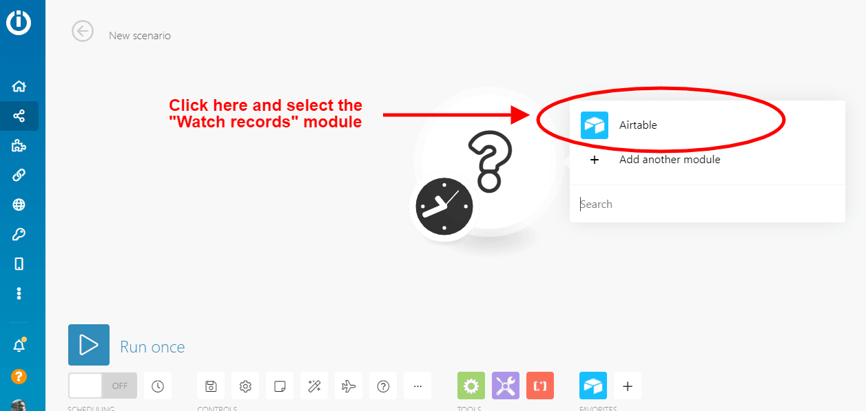In the visual canvas, you will see that the Airtable app has been pre-loaded as your first option. Click on it, and select the “Watch records” module from your options.