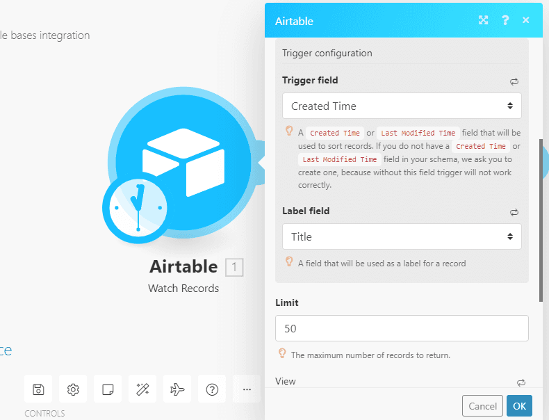 Now, please select “Title” as the label field, and set the limit to 50. This means that you are telling Make to watch up to 50 new records during each “watch records” cycle.