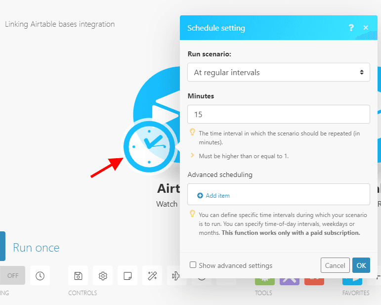 In case it doesn’t, please click on the little clock attached to the first module of your scenario.