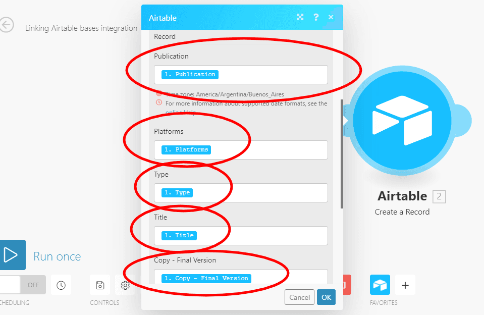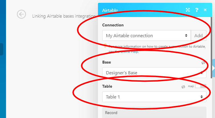 Now that you have set up the first module, it’s time to configure the second (and last) module of this scenario: the “Create a record” Airtable module.