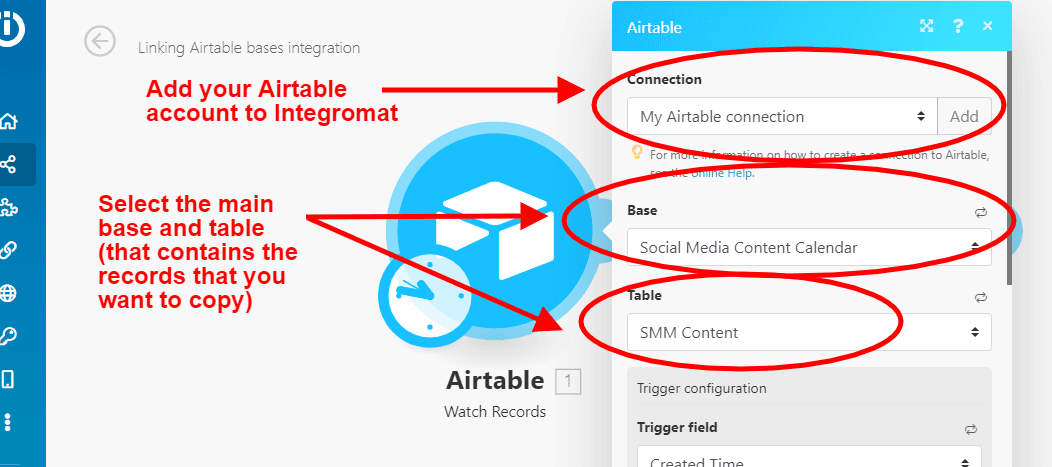 Since we need Make to watch every record in disregard of the contents within, the best way to ensure this happens is by selecting “Created time” as the trigger to watch the records within this table.