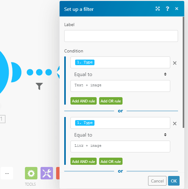 By doing this, the scenario will only copy the records in which the “Type” column features the text above (“Text + image”, or “Link + image”, or “Infographic).