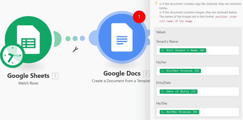 In the second module (Google Docs), we simply need to map the fields that will be retrieved in the first module, to make our document truly dynamic.