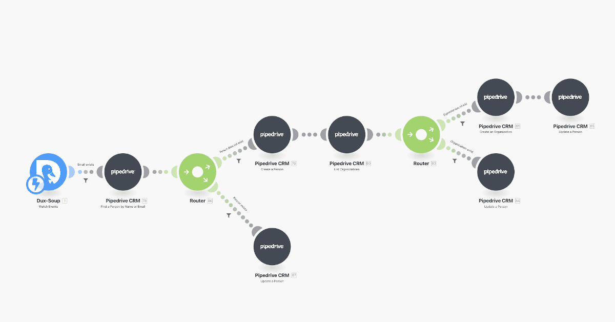 Use this template to connect Dux-Soup to Pipedrive CRM, automatically creating contacts from scanned Linkedin leads.