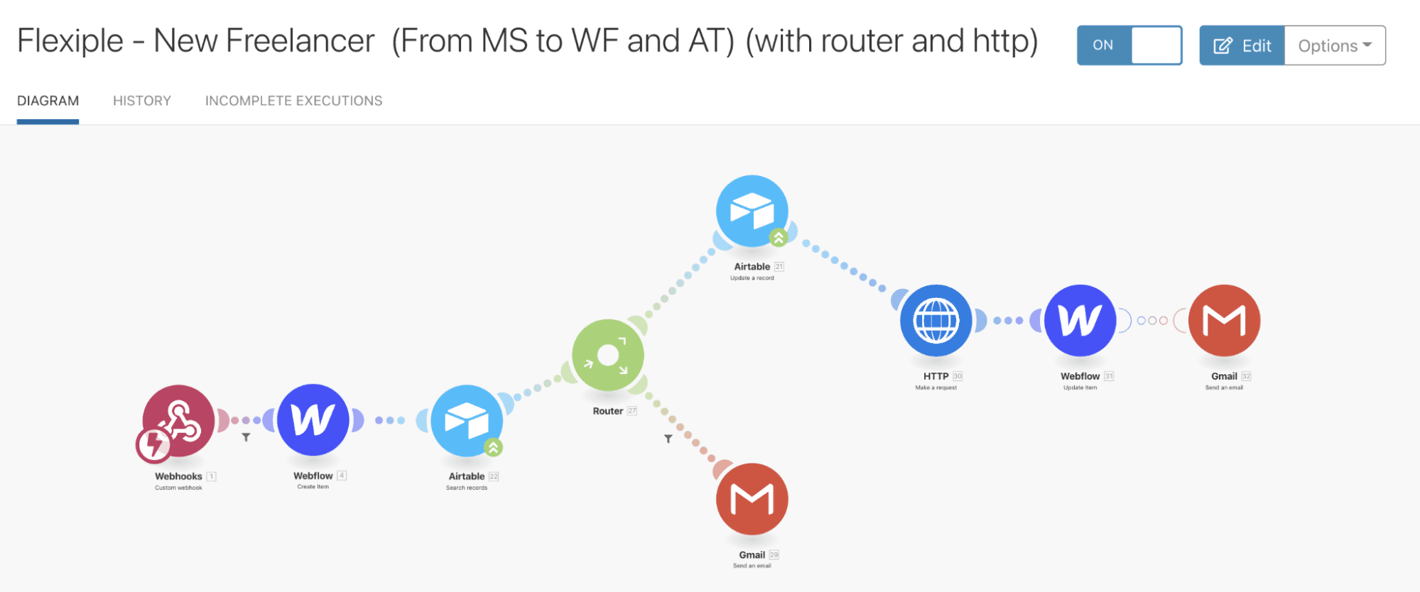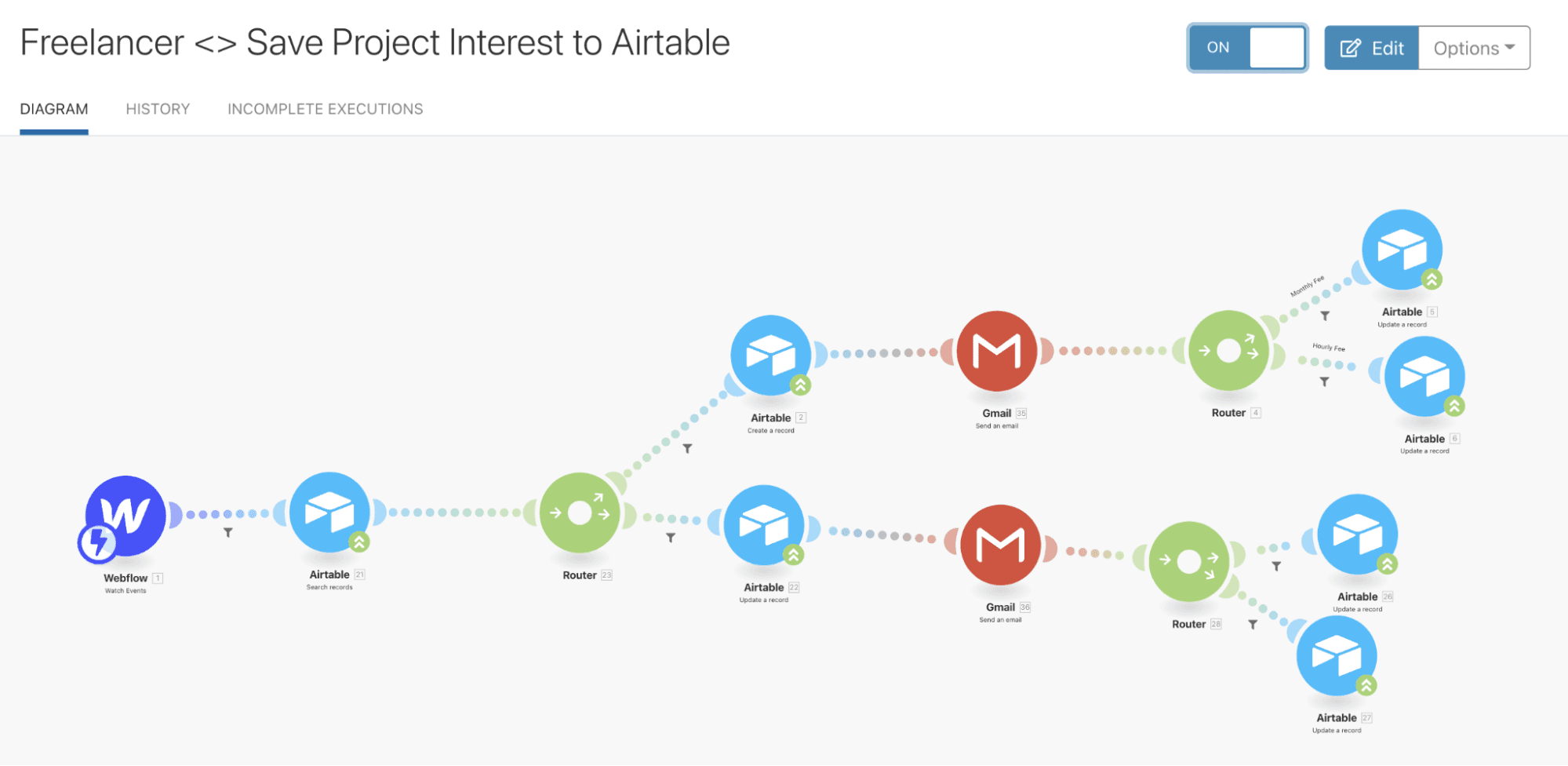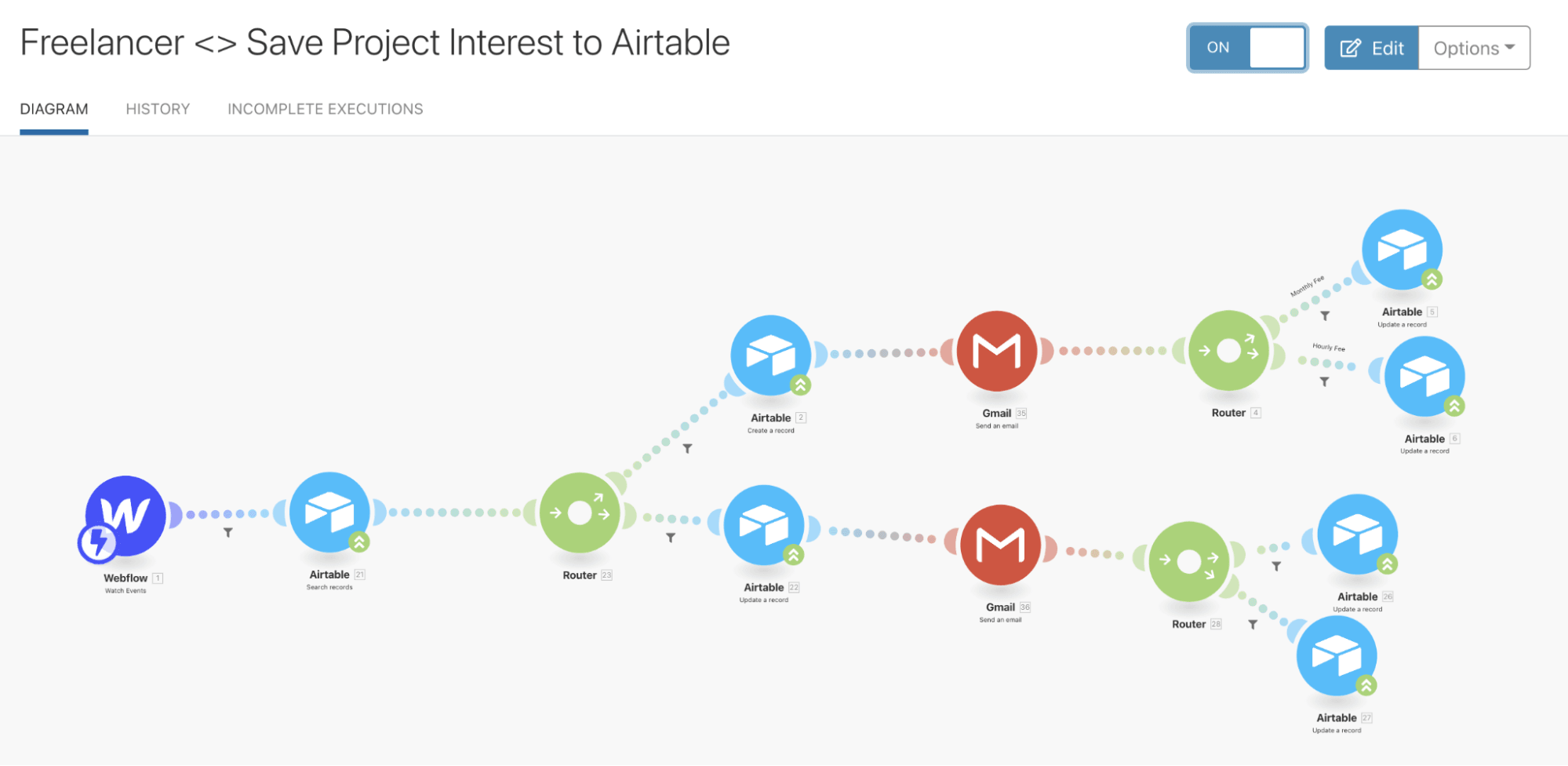 When a freelancer applies to a project, Make saves the details from Webflow to Airtable