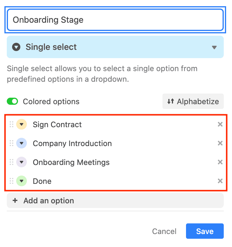 In this database, we have a field called “Onboarding Stage”, with four different options to pick from. Each one of these indicates the status of each new hire.