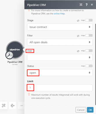 Now select Open in the Status menu to return the deals with an open status. The maximum number of results is set to 1 by default and you can increase this according to individual needs.