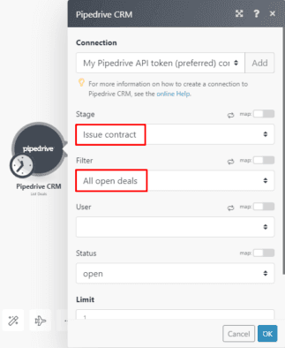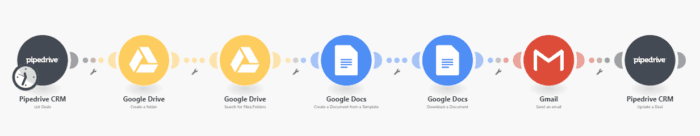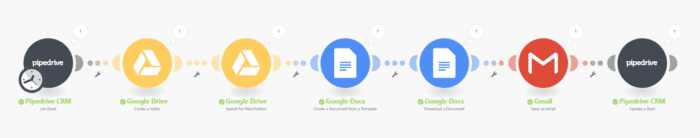 What this scenario does: Retrieves a deal in Pipedrive, creates a Google Doc contract dynamically, emails the contract to the client and updates the stage in Pipedrive.
