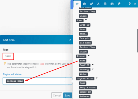 Click on Add item again to create the second tag and use the client’s name as the Replaced Value. Then, map the Person:Name element from the PipeDrive CRM > List deals module to the Replaced Value field: