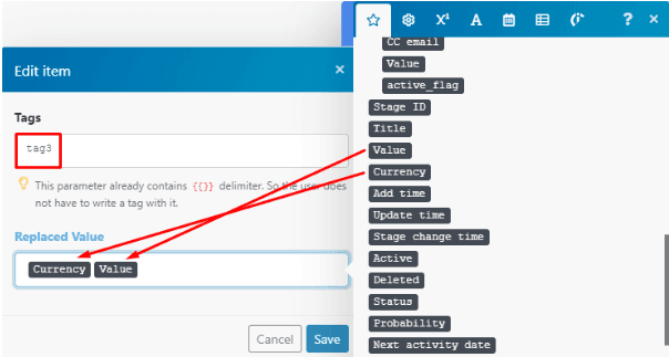 Next, create the third tag and map the currency and value elements outputted by the PipeDrive CRM > List deals module to the Replaced Value field to display the $ value of the deal: