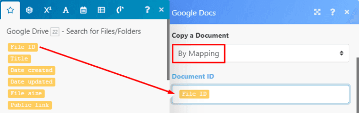 Under the Copy a document menu, select By Mapping and then simply map the File ID outputted by the Google Drive > Search for files/folders module: