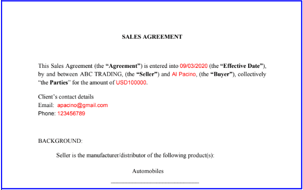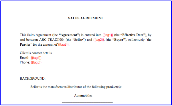 Now you need to create tags and add it to the template. When a new contract is created, the tags are replaced with the information associated with it (client’s details/deal info).