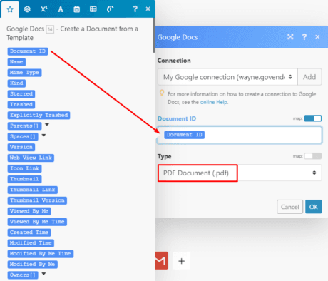 Next, open the Google Docs > Create a document from a template module and as the name states, here you’ll use the contract template retrieved from the preceding module to create the new contract populated with the specific client’s details and deal info.