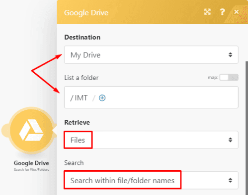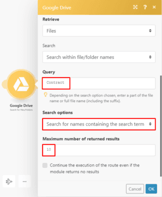 Now search for the contract template that you stored in a specific folder using the Google Drive > Search for files/folders module.