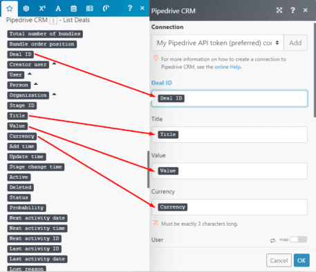 Map the elements outputted by the Pipedrive CRM > List deals module to the corresponding fields: