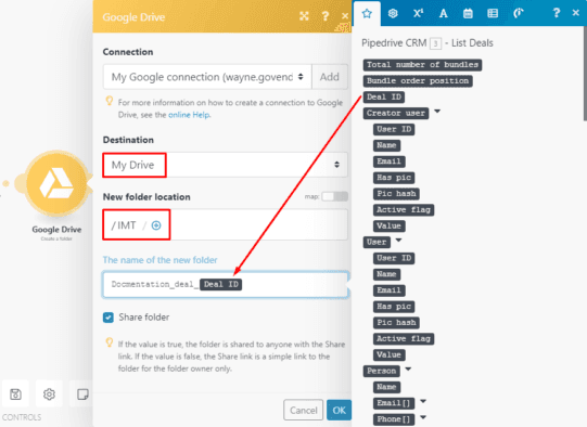 Next, create a folder to store the new document using the Google Drive > Create a folder module.
